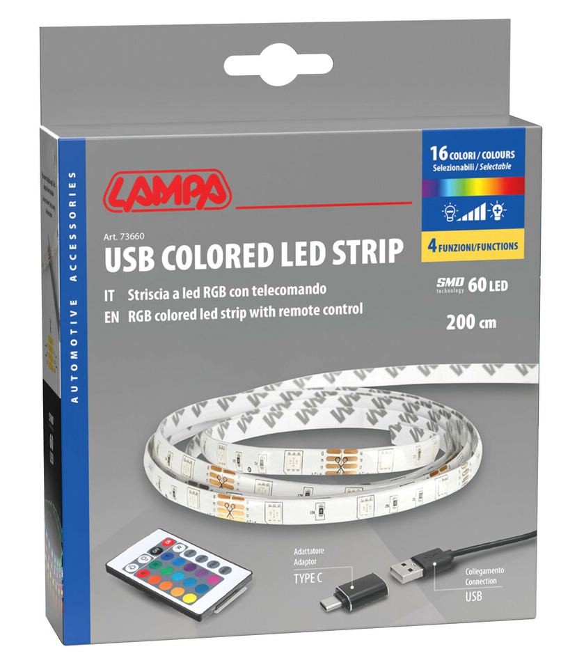 4 různé světelné vzory, funkce stmívání, délka 2m, infračervené dálkové ovládání,